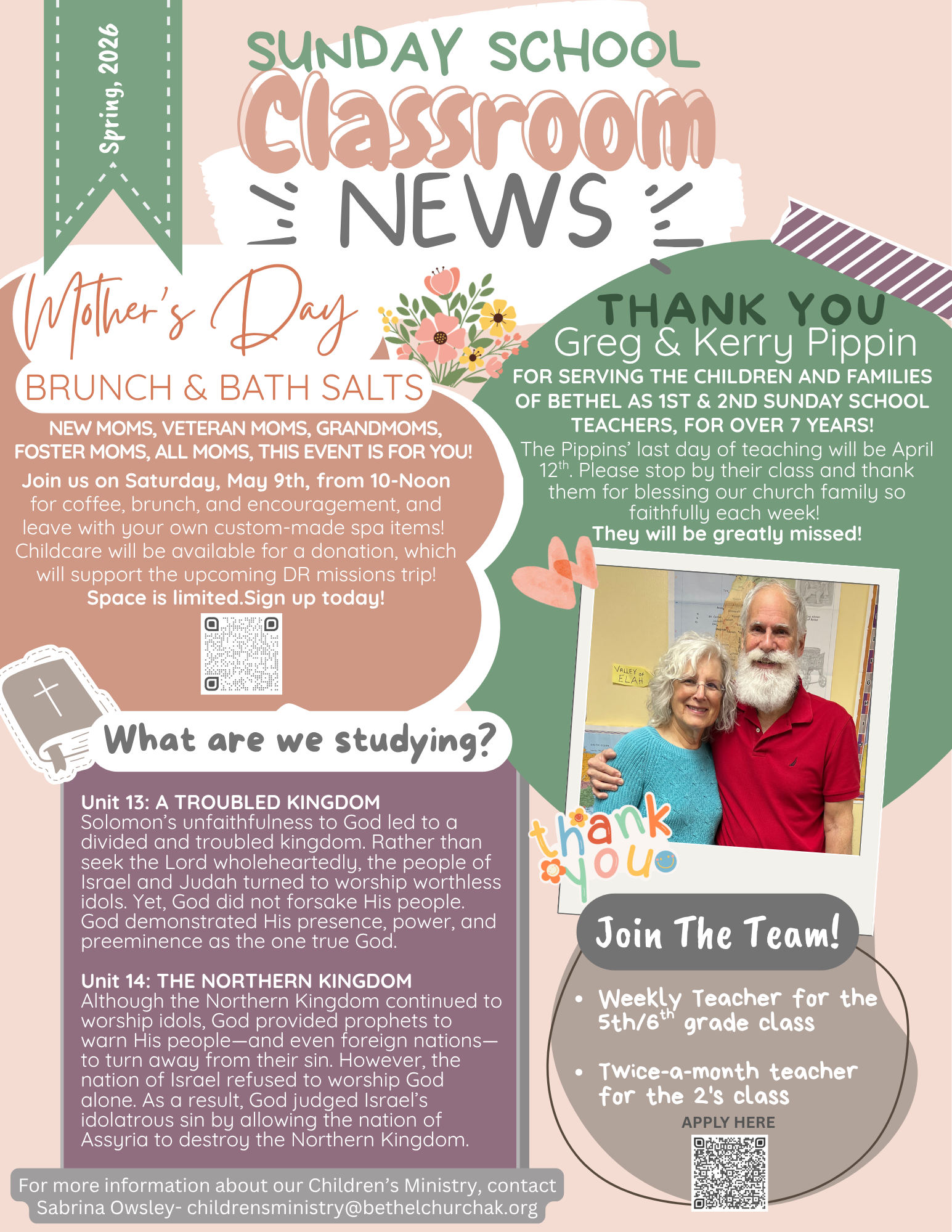 In Sunday School, kids ages 2-6th Grade are using The Gospel Project curriculum. This curriculum goes through the entire Bible from Genesis to Revelation, and the kids hear how the lessons point to the Gospel each week!